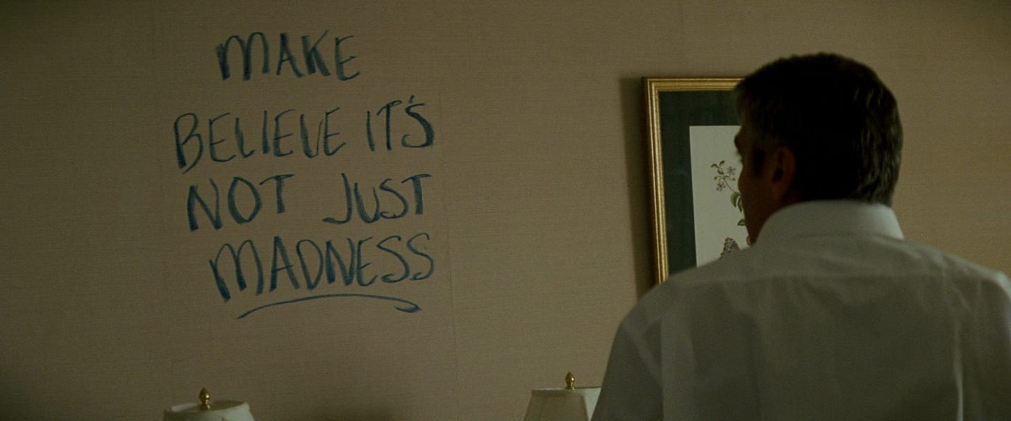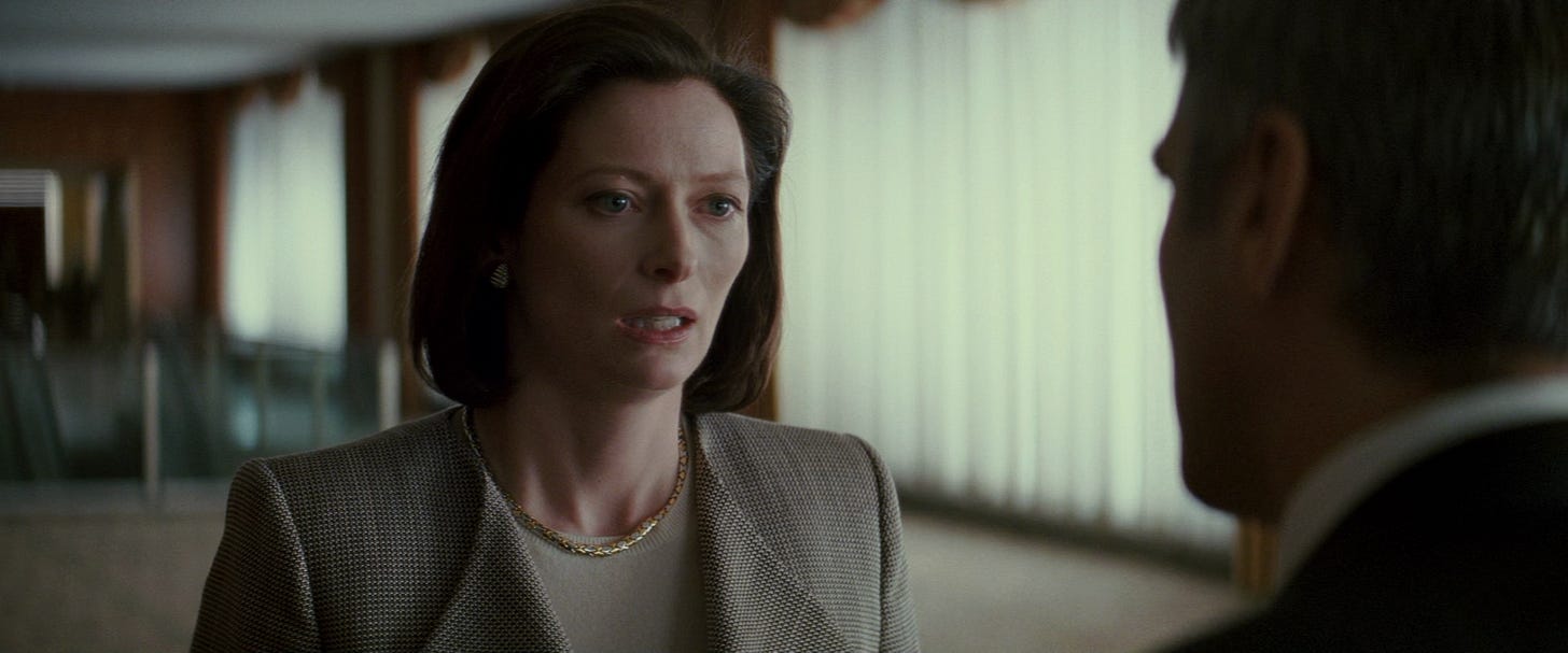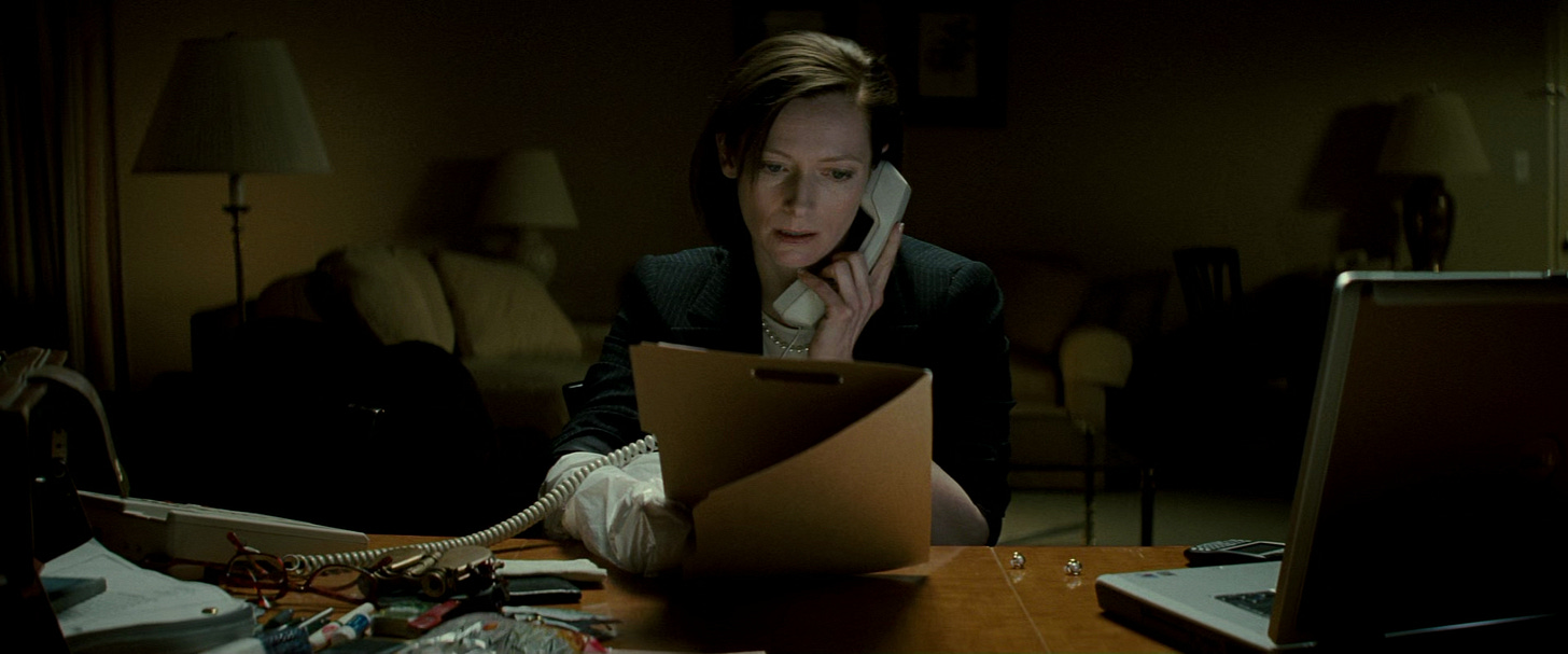 The film has its own history, of course. Gilroy the journeyman, scribbling his way through dreck, dross, and pulp. He spent years scheming Michael Clayton’s script. There were the usual trials of money, cast, production. Its characters and flow and mood were all born from the 2000s. Had it been made by less talented people, it might appear to us as a relic of the before-time. And it was certainly a coincidence that the film arrived when it did, in the same month when the weather turned and ash began to fall from the sky. But it caught, like a flake stolen from the wind, the temper and timbre of cynicism, of weariness, the hint that all this bright light and polished glass, the mock-grandeur and self-assuredness was opaque, transient, and doomed. The cracks were already starting to show. The well-water really was poisoned, foaming, bubbling over.