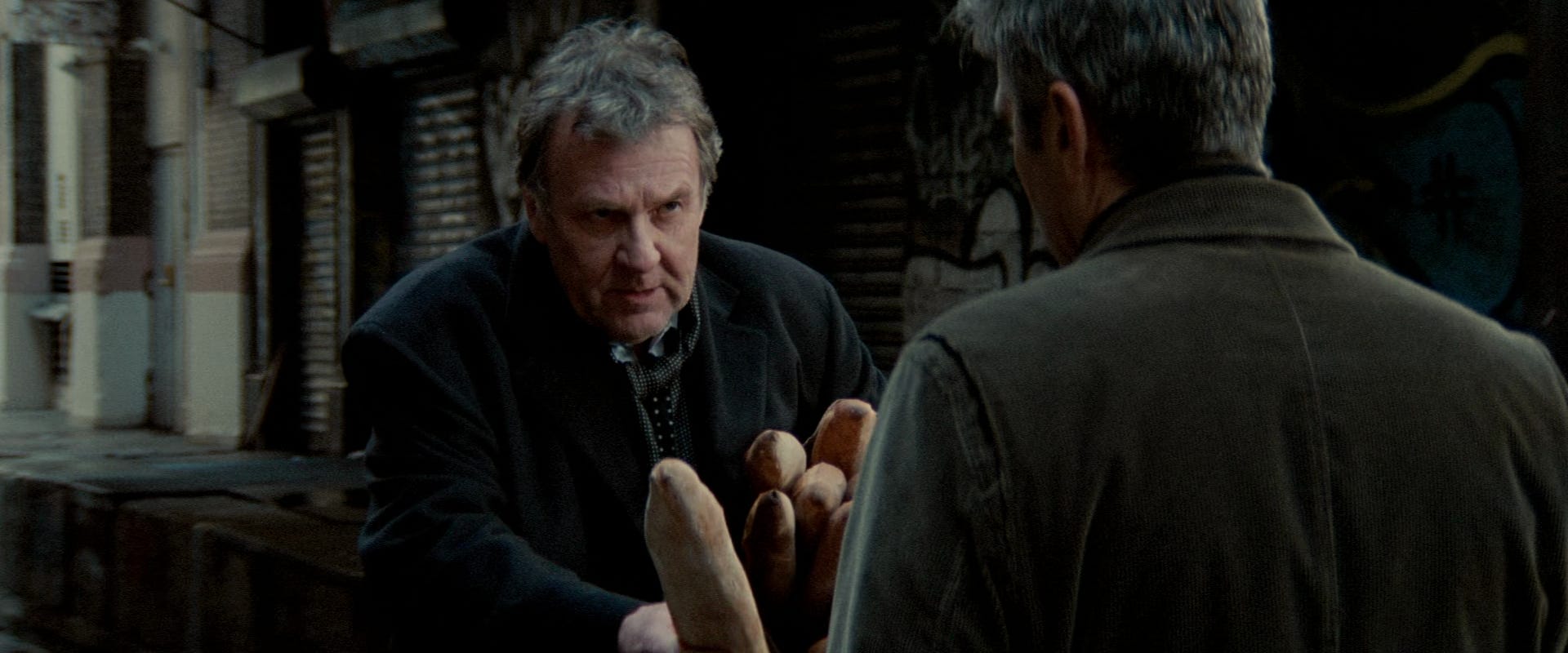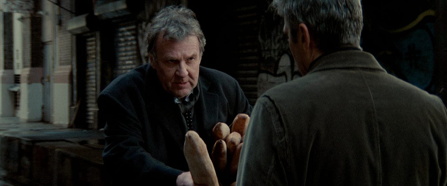 Why shouldn’t you go mad, faced with all that? The daily bucketing-out of conscience, the soul encased and compromised, every shared handshake a trade of favour to the injury of someone else. Wearing the extraordinary guise of the late Tom Wilkinson, Arthur introduces the element of insanity to Michael Clayton – the question of who in all this smooth, too-easy seediness is really off their rocker. Arthur, poor Arthur. We’re told he’s mad. Signs of it everywhere. An episode a few years back; the pills set it right. There was a wife, apparently, and a kid, and a more conventional home – one perhaps more recognisable to the gaudy-baroque palette of his partners than the crumbling bohemian studio where he lives and where he will die. Tearing his clothes in a deposition room, shouting wild love for a milkmaid. He has all the obvious marks of mania: the Mach 5 pace of his turmoil, the franticness, the bizzarro behaviour. He inflates everything. Size, scale, crescendo – seventeen baguettes in his bundle – a thousand printed copies of Summons to Conquest – stripping himself to zero – “six years…four hundred depositions, a hundred motions, five changes of venue, eighty-five thousand documents in discovery…thirty-thousand billable hours…and the numbers are making me dizzy…”