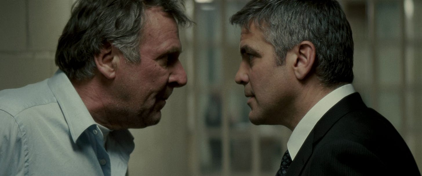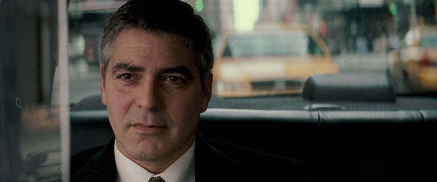 STUDY THAT FACE. WHAT is cinema for if not to scan the crags and prairies of a face with the same hunger we probe a scoured battlefield, or a far planet’s unknowable peaks. Study that face, and what does it tell you? It’s a moviestar’s mug, no doubt. It’s George Clooney. But it’s a palled and pallid Clooney. Slightly puffy, bag-eyed, Kentucky tan gone cold. Grey-lit, barely there, tired in the bones. He is playing Michael Clayton, in the final frames of the 2007 film of the same name, a patcher and mender of a sickly order. We saw him, just now, a few moments ago, use his skill and status as a middle-rank bagman to ensnare a murderess. The grubbier tools of his trade have been put to better use, for once. But here he’s sunk in the back of a yellow taxi and the notes of his theme run sombre downward. These are not the scales of victory. Something approaching grief. And still the shot lingers. Nothing but the face. What passes over? A wince perhaps, a shade of embarrassment. Then a half-smile which is the outward mark of a memory briefly cherished. We keep holding. Futility, maybe. Lip-curl of disgust. Might be emptiness, after all. Marrow-emptiness: the kind that trails the slow release of long-held breath, or when an adrenaline high retreats like the tide, and all that’s left is a parched shore.